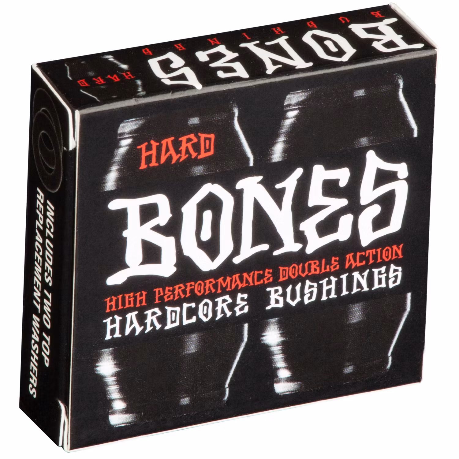 The HardCore insert in the center of BONES bushings connects the two sides of each bushing together by bonding them to the HardCore insert. When the hanger web squeezes one side of a HardCore bushing, that side of the bushing reacts just like a normal bushing, but the chemical bond between the HardCore and the cushion keep the bushing from being squeezed out the other side. It actually increases the resistance to turning because it is held in place by the HardCore insert. This means basically that BOTH sides of the BONES HardCore Bushing are resisting your turning force. That’s why we call BONES Bushings the first double action truck bushings.
