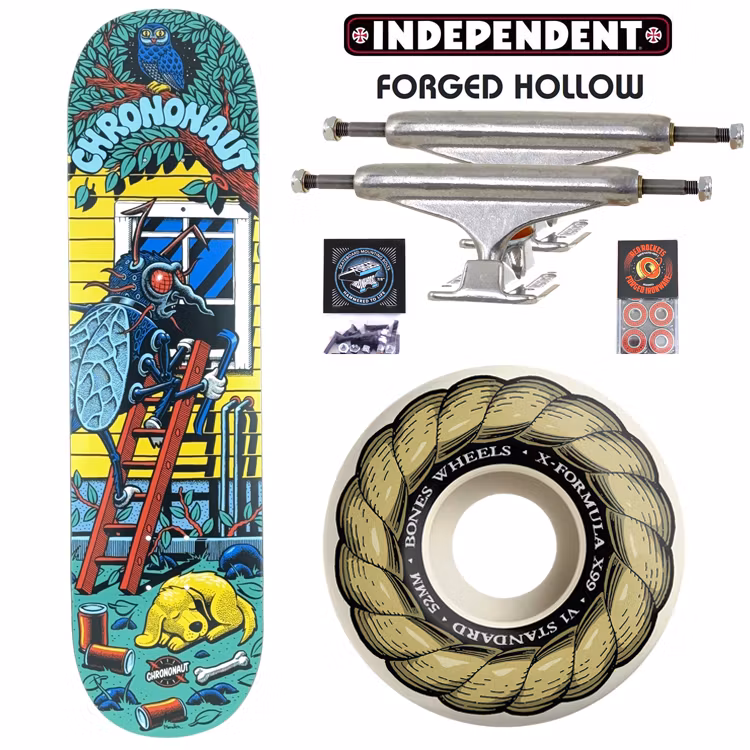 Pro complete is shipped in parts. This includes Chrononaut deck ( Grip of your choice ), Independent trucks, Forged Ironware Hardware, Red Rockets bearings and Bones x Formula 99a wheels