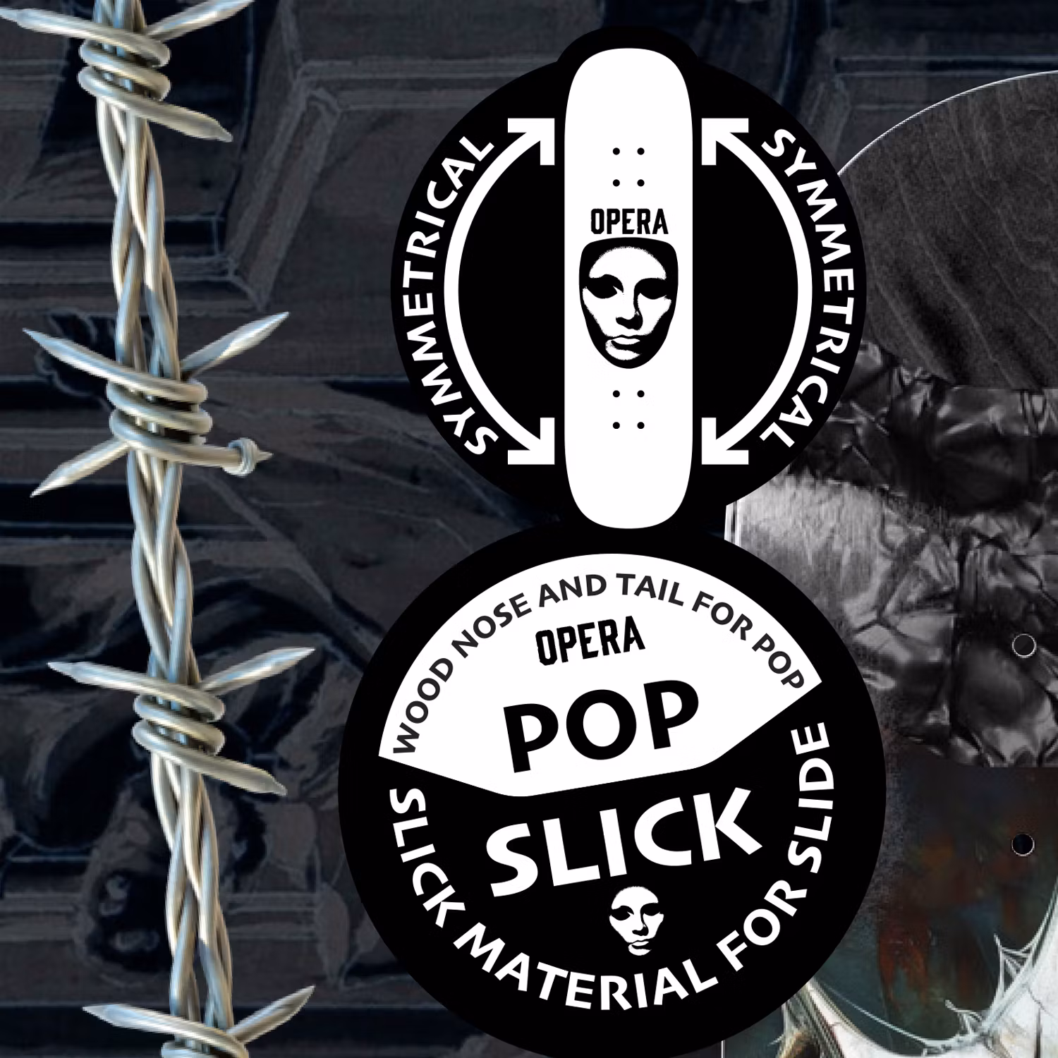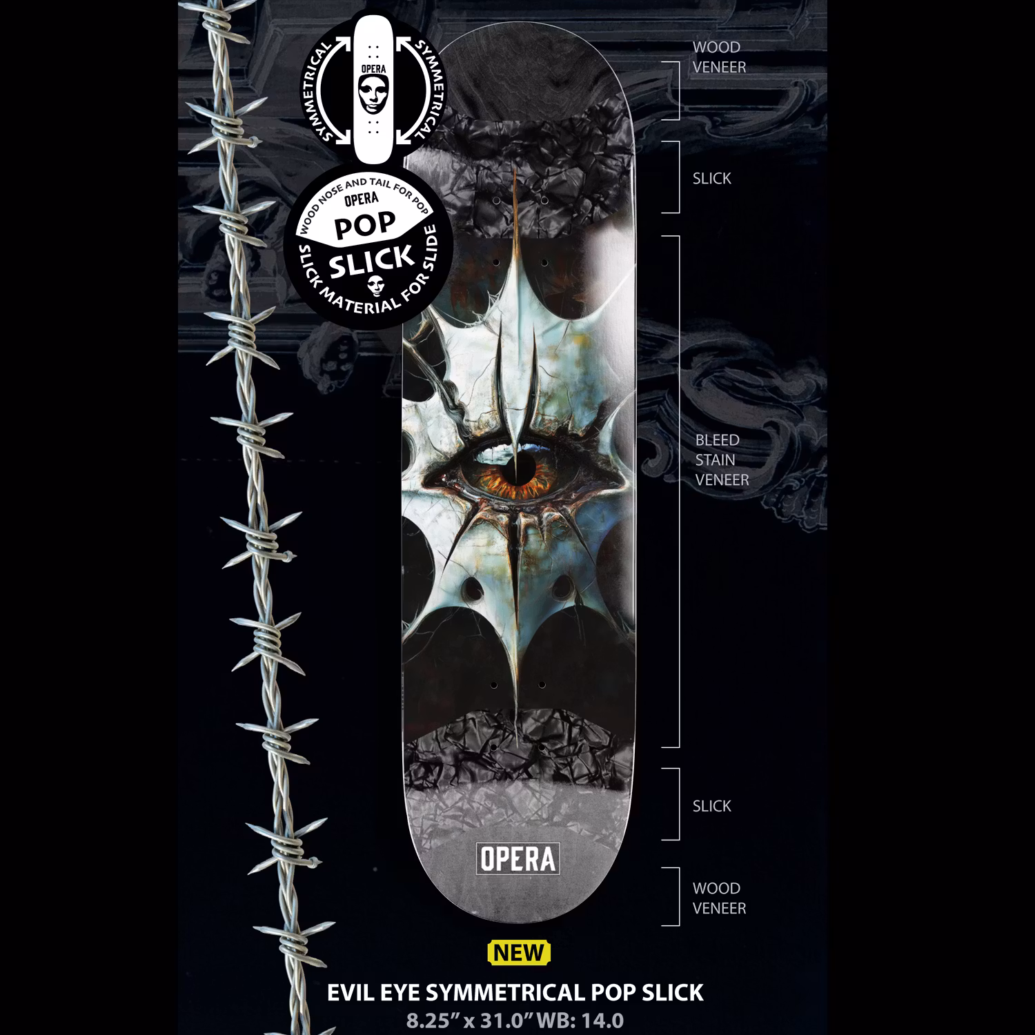 Opera Evil Eye Symmetrical Pop Slick 8,25'' 14'' Wheelbase with slick inserts on nose and tail to make butter slides everytime.